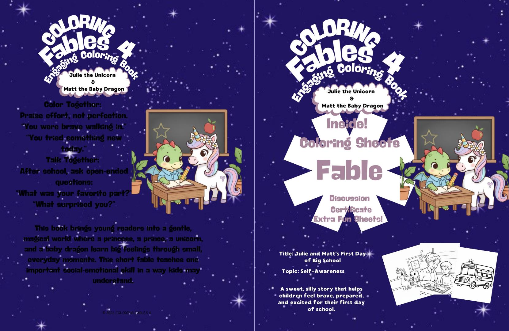 Coloring Fables 4 stories and activities are designed to be warm, imaginative, and supportive learning tools for children. However, every child and family is unique. Some readers may interpret themes, characters, or lessons differently based on age, background, or personal experiences.